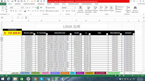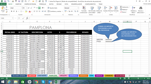 1.-) Sumar por Proveedor (columna "I") y que además sume si el vencimiento es mayor que la fecha actual (columna "F"),