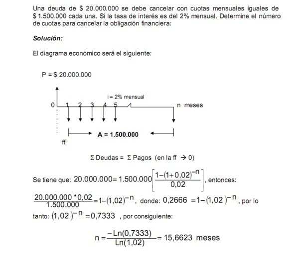 $$\begin{align}&\text{La fórmula de amortización del préstamo francés es}\\&\\&c=\frac{C_o·i}{1-(1+i)^{-n}}\\&\\&\text{La tasa peródica mensual es}\\&i=\frac{0.28}{12}=0.02333...\\&\\&$\,800\,000=\frac{$\,60\,000\,000·0.02333...}{1-(1.02333...)^{-n}}\\&\\&800\,000=\frac{1\,400\,000}{1-(1.02333...)^{-n}}\\&\\&1-(1.02333...)^{-n}=\frac{1\,400\,000}{800\,000}=1.75\\&\\&(1.02333...)^{-n}=-0.75\end{align}$$Y eso no tiene respuesta real, una exponencial es siempre positiva.