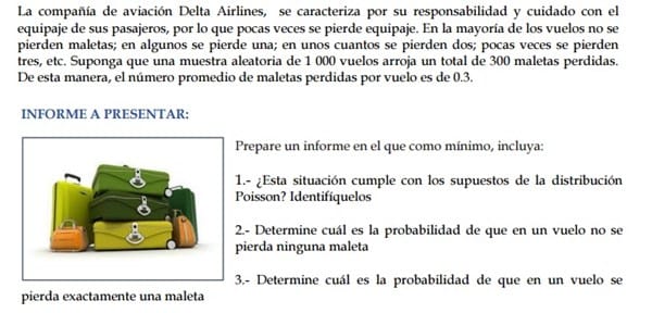 El elemento que se necesita es la media de sucesos que ocurren en una unidad de es·pacio o tiempo. En este caso son 0.3 maletas perdidas por vuelo.