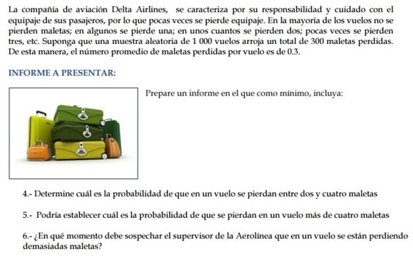 $$\begin{align}&4)\\&P(4)=\frac{e^{-0.3}·0.3^4}{4!}=\frac{e^{-0.3}·0.0081}{24}=0.00025002615\\&\\&5)\\&\text{Sí.  Habría que restar de 1 la probabilidad de perder}\\&\text{0,1,2,3,4 maletas}\\&\text{Aunque se podría aprovechar lo hecho lo haré todo de}\\&\text{nuevo en sola una cuenta}\\&\\&P(X>4)=1-e^{-0.3}\left(1+0.3+\frac{0.3^2}{2}+\frac{0.3^3}{6}+\frac{0.3^4}{24}  \right)=\\&\\&1-e^{-0.3}· 1.3498375 = 1-0.999984215=0.00001578504\\&\\&6)  \text{Yo creo que si se pierden 2 ya son muchas, porque la }\\&\text{probabilidad de perder 2 o más solo es}\\&\\&1-e^{-0.3}\left(1+0.3\right)=0.03669= 3.67\%\end{align}$$Y eso es todo.