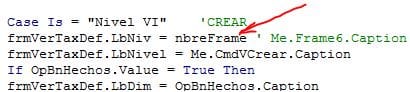 Private Sub CmdDefinicion_Click() Select Case Frame Case Me.Frame1.ActiveControl 'With Frame1.ActiveControl 'Then frmVerTaxDef.LbNiv = Frame1.Caption frmVerTaxDef.LbNivel = CmdVRecordar.Caption If OpBnHechos.Value = True Then frmVerTaxDef.LbDim = OpBnHechos.Caption ElseIf OpBnConcept.Value = True Then frmVerTaxDef.LbDim = OpBnConcept.Caption ElseIf OpBnProces.Value = True Then frmVerTaxDef.LbDim = OpBnProces.Caption ElseIf OpBnProced.Value = True Then frmVerTaxDef.LbDim = OpBnProced.Caption ElseIf OpBnPrinc.Value = True Then frmVerTaxDef.LbDim = OpBnPrinc.Caption ElseIf OpBnMetaCog.Value = True Then frmVerTaxDef.LbDim = OpBnMetaCog.Caption End If 'End With Case Me.Frame2.ActiveControl 'With Frame2.ActiveControl 'Then frmVerTaxDef.LbNiv = Frame2.Caption frmVerTaxDef.LbNivel = CmdVComprender.Caption If OpBnHechos.Value = True Then frmVerTaxDef.LbDim = OpBnHechos.Caption ElseIf OpBnConcept.Value = True Then frmVerTaxDef.LbDim = OpBnConcept.Caption ElseIf OpBnProces.Value = True Then frmVerTaxDef.LbDim = OpBnProces.Caption ElseIf OpBnProced.Value = True Then frmVerTaxDef.LbDim = OpBnProced.Caption ElseIf OpBnPrinc.Value = True Then frmVerTaxDef.LbDim = OpBnPrinc.Caption ElseIf OpBnMetaCog.Value = True Then frmVerTaxDef.LbDim = OpBnMetaCog.Caption End If 'End With Case Me.Frame3.ActiveControl 'With Frame3.ActiveControl 'Then frmVerTaxDef.LbNiv = Frame3.Caption frmVerTaxDef.LbNivel = CmdVAplicar.Caption If OpBnHechos.Value = True Then frmVerTaxDef.LbDim = OpBnHechos.Caption ElseIf OpBnConcept.Value = True Then frmVerTaxDef.LbDim = OpBnConcept.Caption ElseIf OpBnProces.Value = True Then frmVerTaxDef.LbDim = OpBnProces.Caption ElseIf OpBnProced.Value = True Then frmVerTaxDef.LbDim = OpBnProced.Caption ElseIf OpBnPrinc.Value = True Then frmVerTaxDef.LbDim = OpBnPrinc.Caption ElseIf OpBnMetaCog.Value = True Then frmVerTaxDef.LbDim = OpBnMetaCog.Caption End If 'End With Case Me.Frame4.ActiveControl 'With Frame4.ActiveControl 'Then frmVerTaxDef.LbNiv = Frame4.Caption frmVerTaxDef.LbNivel = CmdVAnalizar.Caption If OpBnHechos.Value = True Then frmVerTaxDef.LbDim = OpBnHechos.Caption ElseIf OpBnConcept.Value = True Then frmVerTaxDef.LbDim = OpBnConcept.Caption ElseIf OpBnProces.Value = True Then frmVerTaxDef.LbDim = OpBnProces.Caption ElseIf OpBnProced.Value = True Then frmVerTaxDef.LbDim = OpBnProced.Caption ElseIf OpBnPrinc.Value = True Then frmVerTaxDef.LbDim = OpBnPrinc.Caption ElseIf OpBnMetaCog.Value = True Then frmVerTaxDef.LbDim = OpBnMetaCog.Caption End If 'End With Case Me.Frame5.ActiveControl 'With Frame5.ActiveControl 'Then frmVerTaxDef.LbNiv = Me.Frame5.Caption frmVerTaxDef.LbNivel = Me.CmdVEvaluar.Caption If OpBnHechos.Value = True Then frmVerTaxDef.LbDim = OpBnHechos.Caption ElseIf OpBnConcept.Value = True Then frmVerTaxDef.LbDim = OpBnConcept.Caption ElseIf OpBnProces.Value = True Then frmVerTaxDef.LbDim = OpBnProces.Caption ElseIf OpBnProced.Value = True Then frmVerTaxDef.LbDim = OpBnProced.Caption ElseIf OpBnPrinc.Value = True Then frmVerTaxDef.LbDim = OpBnPrinc.Caption ElseIf OpBnMetaCog.Value = True Then frmVerTaxDef.LbDim = OpBnMetaCog.Caption End If 'End With Case Me.Frame6.ActiveControl 'With Frame6.ActiveControl 'Then frmVerTaxDef.LbNiv = Me.Frame6.Caption frmVerTaxDef.LbNivel = Me.CmdVCrear.Caption If OpBnHechos.Value = True Then frmVerTaxDef.LbDim = OpBnHechos.Caption ElseIf OpBnConcept.Value = True Then frmVerTaxDef.LbDim = OpBnConcept.Caption ElseIf OpBnProces.Value = True Then frmVerTaxDef.LbDim = OpBnProces.Caption ElseIf OpBnProced.Value = True Then frmVerTaxDef.LbDim = OpBnProced.Caption ElseIf OpBnPrinc.Value = True Then frmVerTaxDef.LbDim = OpBnPrinc.Caption ElseIf OpBnMetaCog.Value = True Then frmVerTaxDef.LbDim = OpBnMetaCog.Caption End If Case Else MsgBox "Debe seleccionar" 'End With End Select