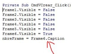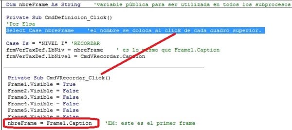 Para mostrar solo uno de estos frames uso otro commandbuton que hace que no hagan visibles los demás y solo quede uno que haya seleccionado, entonces ese es el CASE. Expongo el óodigo allí se encontraran con códigos que se refieren a Hechos, Conceptos, Proceso, Procedimiento, Principios y MetaCognición, estos option butons están contenidos en cada uno de lo 6 frames. El caption de cada frame es Nivel I, Nivel II, ... Nivel VI: