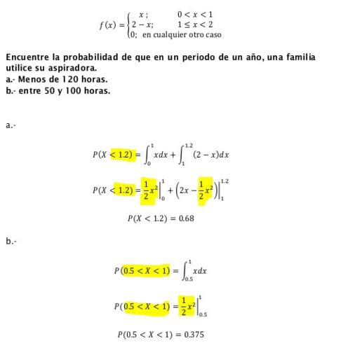 El número total de horas, medidas en unidades de 100 horas, que una familia utiliza una aspiradora en un periodo de un año es una variable aleatoria continua X que tiene la siguiente función de densidad: