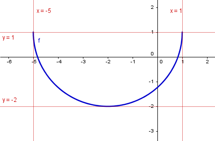 Determine el dominio y me dio como resultado [-5,1] y su recorrido me dice que toma el punto 1 en el eje y, y tengo de respuesta de que mi recorrido es [1,4], saque el vértice, ya que es una parábola con una discrminante cuyo valor es menor a 0, por lo tanto no toca al eje por . Quiero saber como puede definir ese intervalo [1,4] o como puedo llegar a eso