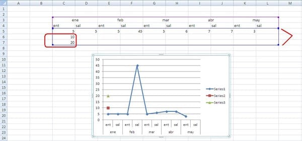 ActiveChart.SetSourceData Source:=Range("C7:K10,C" & Target.Row & ":K" & Target.Row)