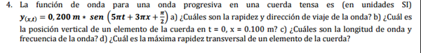 La función de onda para una onda progresiva en una cuerda tensa es (en unidades SI)