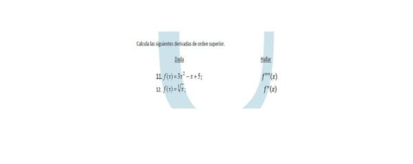 $$\begin{align}&\text{Usaremos estas reglas}\\&(f+g)'=f'+g'\\&(k·f)'=k·f'\qquad\text{Siendo k una constante de }\mathbb R\\&(x^n)'=nx^{n-1}\\&\text{Se puede deducir de la anterior, pero es mejor aplicar}\\&\text{directamente que la derivada de una constante es 0}\\&\\&11)\quad f(x)=3x^2-x-5\\&\\&f'(x)=6x-1\\&\\&f''(x)=6\\&\\&f'''(x)=0\\&\\&f''''(x)=0\\&\\&\\&12)\quad f(x) = \sqrt[3]x\\&\\&\text{Para trabajar bien lo ponemos en exponencial}\\&\\&f(x)=x^{\frac 13}\\&\\&f'(x) = \frac 13x^{\frac 13-1}=\frac 13 x^{-\frac 23}\\&\\&f''(x)= \frac 13·\left(-\frac 23 \right)x^{-\frac 23-1}=-\frac{2}{9}x^{-\frac 53}=-\frac{2}{9 \sqrt[3]{x^5}}\end{align}$$