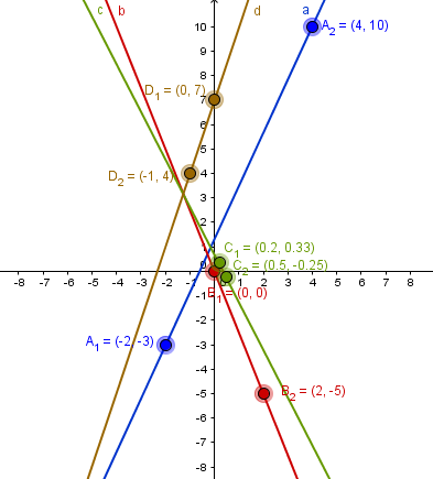 $$\begin{align}&\text{Dados los puntos }(x_1,y_1),(x_2,y_2) \text{ la recta es}\\&\\&y=y_1+\frac{y_2-y_1}{x_2-x_1}(x-x_1)\\&\\&a) (-2,-3) y (4,10)\\&\\&y=-3+ \frac{10+3}{4+2}(x+2)\\&\\&y=-3+\frac {13}6(x+2)\\&\\&y=\frac {13}6x+\frac 43\\&\\&\\&\\&b) (0,0), (2,-5)\\&\\&y= 0+\frac {-5-0}{2-0}(x-0)\\&\\&y=-\frac{5}{2}x\\&\\&\\&\\&c) (0.2,1/3) y (0.5,-1/4)\\&\text{qué feos, todo a fraccionales}\\&(1/5, 1/3) y (1/2, -1/4)\\&\\&y=\frac 13+\frac{-\frac 14-\frac 13}{\frac 12-\frac 15}\left(x-\frac 15\right)\\&\\&y=\frac 13 +\frac{-\frac 7{12}}{\frac 3{10}}\left(x-\frac 15\right)\\&\\&y=\frac 13-\frac{70}{36}\left(x-\frac 15\right)\\&\\&y=-\frac{35}{18}x+\frac 13+\frac{35}{90}\\&\\&y=-\frac{35}{18}x+\frac{65}{90}\\&\\&y= -\frac{35}{18}x+\frac{13}{18}\\&\\&\\&d) (0,7) y (-1,4)\\&\\&y=7 + \frac{4-7}{-1-0}(x-0)\\&\\&y=7+3x\end{align}$$Y esta es la gráfica.