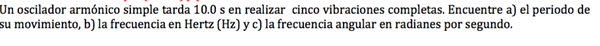 Un oscilador armónico simple tarda 10.0 s en realizar cinco vibraciones completas.