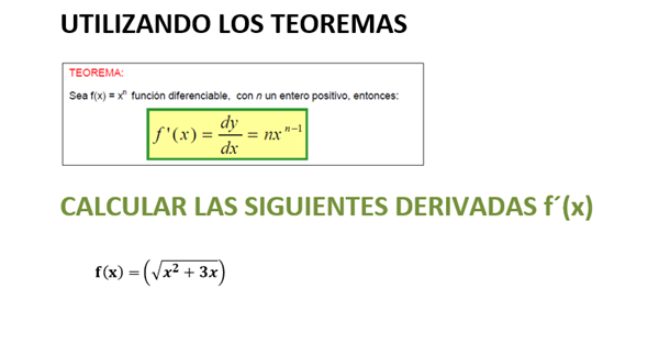 $$\begin{align}&(f+g)'=f'+g'\\&(k·f)'= k·f'\qquad \forall k \in \mathbb R\\&(f[g(x)])'=f'[g(x)]·g'(x)\\&\\&f(x)=\sqrt {x^2+3x}\\&\\&\text{Ponemos la raíz en forma de exponente}\\&\\&f(x)= (x^2+3x)^{\frac 12}\\&\\&f'(x)=\frac 12(x^2+3x)^{\frac 12-1}·(x^2+3x)'=\\&\\&\frac 12(x^2+3x)^{-\frac 12}(2x+3)=\\&\\&\text{le devolvemos la forma original}\\&\\&=\frac{1}{2}·\frac{1}{(x^2+3x)^{\frac 12}}·(2x+3)=\\&\\&\frac{2x+3}{2 \sqrt{x^2+3x}}\\&\\&\end{align}$$Y eso es todo, estas cosas se hacen en un solo paso, pero aqui están todos los que hay que dar.