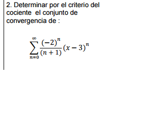 $$\begin{align}&\lim_{n\to \infty} \left| \frac{a_{n+1}}{a_n} \right|<1\\&\\&\lim_{n\to \infty} \left|\frac{\frac{(-2)^{n+1}}{n+2}(x-3)^{n+1}}{\frac{(-2)^{n}}{n+1}(x-3)^{n}} \right|=\\&\\&\text{que tengan signo contrario no afecta al módulo}\\&\text{podemos simplicar 2 con -2}\\&\\&\lim_{n\to \infty} \left|\frac{\frac{1}{n+2}(x-3)}{\frac 1{n+1}} \right|=\lim_{n\to \infty} \left|\frac{n+1}{n+2}(x-3) \right|=\\&\\&\text{dividimos por n el numerador y denominador}\\&\\&\lim_{n\to \infty} \left|\frac{1+\frac 1n}{1+\frac 2n}(x-3) \right|= \left|\frac{1+0}{1+0}(x-3) \right|=|x-3|\lt1\\&\\&-1\lt x-3 \lt 1\\&\\&2\lt x\lt 4\\&\\&\text{Luego el conjunto de convergencia es}\\&\\&CC=(2,4)\\&\\&\end{align}$$Los puntos 2 y 4 no entran. Para esos caso queda una serie