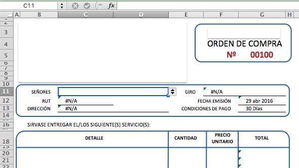 celda C11 = texto ingresado en el campo que corresponde al nombre del proveedor