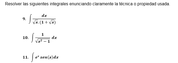 $$\begin{align}&9) \int \frac{dx}{\sqrt x(1+ \sqrt x)}=\\&\\&t=\sqrt x\\&dt=\frac{dx}{2 \sqrt x}\implies \frac{dx}{\sqrt x}=2\,dt\\&\\&\int \frac{2dt}{1+t}=2 ln|1+t|+C=2ln(1+\sqrt x)+C\\&\\&\end{align}$$La segunda es complicadísima por cambio trigonométrico. Si dices que se puede hacer con cambio hiperbólico mándala en otra pregunta y la resuelvo allí.