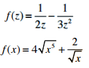 $$\begin{align}&(f+g)'=f'+g'\\&(k·f)'=k·f' \qquad \text{siendo k una constante de }\mathbb R\\&(x^n)'=nx^{n-1}\\&\\&\frac{u}{v·x^n}=\frac uv x^{-n}\\&\\&\sqrt[n]{x^m}=x^{\frac{m}{n}}\\&\\&\\&f(z)=\frac{1}{2z}-\frac{1}{3z^2}\\&\\&f(z) = \frac 12 {z^{-1}}-\frac 13z^{-2}\\&\\&f'(z)= \frac 12·(-1)z^{-2}-\frac 13·(-2)z^{-3}=\\&\\&-\frac{1}{2}z^{-2}+\frac 23z^{-3}=\\&\\&\text{lo dejamos como nos lo entregaron}\\&\\&-\frac{1}{2z^2}+ \frac{2}{3z^3}\\&\\&---------------\\&\\&f(x)=4 \sqrt x^5+\frac 2{\sqrt x}\\&\\&f(x)= 4x^{\frac 52}+2x^{-\frac 12}\\&\\&f'(x)= 4·\frac 52·x^{\frac 32}+2·\left(-\frac 12 \right)x^{-\frac 32}=\\&\\&10x^{\frac 32}-x^{-\frac 32}=\\&\\&\text{y lo dejamos de la forma que vino}\\&\\&10 \sqrt{x^3}-\frac{1}{\sqrt{x^3}}\\&\\&\\&\\&\end{align}$$Y eso es todo sa lu dos.
