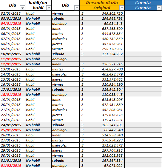 Ejemplo1--> si el recaudo original fue un miércoles, dicho recaudo debe sumarse solo en la celda E el día viernes, dos días hábiles después.