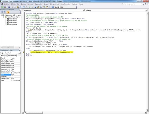 Private Sub Worksheet_Change(ByVal Target As Range) 'x Elsamatilde 'se controla lo ingresado en rango A1:E3 If Intersect(Target, Range("AA1:AE3")) Is Nothing Then Exit Sub 'si se modifican varias celdas (x ej para borrarlas) no se ejecuta If Target.Count > 1 Then Exit Sub Dim x As Byte, i As Byte 'se mira en la cadena, si estaba se la quita For i = 1 To 5 If Val(Mid(Cells(Target.Row, "AH"), i, 1)) <> Target.Column Then cadena2 = cadena2 & Mid(Cells(Target.Row, "AH"), i, 1) Next i Cells(Target.Row, "AH") = cadena2 'si es mayor que 3 agrega en H1 el nro de col If Len(Target.Value) > 3 Then Cells(Target.Row, "AH") = Cells(Target.Row, "AH") & Target.Column 'según el último caracter en H será el texto en F If Len(Cells(Target.Row, "AH")) = 0 Then Cells(Target.Row, "AF") = "" ElseIf Len(Cells(Target.Row, "AH")) = 1 Then Cells(Target.Row, "AF") = Cells(Target.Row, Cells(Target.Row, "AH")) Else x = (Right(Cells(Target.Row, "AH"), 1)) Cells(Target.Row, "AF") = Cells(Target.Row, x) End If End Sub