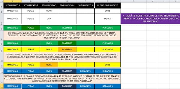 Private Sub Worksheet_Change(ByVal Target As Range) 'x Elsamatilde 'se controla lo ingresado en rango A1:E3 If Intersect(Target, Range("A1:E3")) Is Nothing Then Exit Sub 'si se modifican varias celdas (x ej para borrarlas) no se ejecuta If Target.Count > 1 Then Exit Sub Dim x As Byte, i As Byte 'se mira en la cadena, si estaba se la quita For i = 1 To 5 If Val(Mid(Cells(Target.Row, "H"), i, 1)) <> Target.Column Then cadena2 = cadena2 & Mid(Cells(Target.Row, "H"), i, 1) Next i Cells(Target.Row, "H") = cadena2 'si es mayor que 3 agrega en H1 el nro de col If Len(Target.Value) > 3 Then Cells(Target.Row, "H") = Cells(Target.Row, "H") & Target.Column 'según el último caracter en H será el texto en F If Len(Cells(Target.Row, "H")) = 0 Then Cells(Target.Row, "F") = "" ElseIf Len(Cells(Target.Row, "H")) = 1 Then Cells(Target.Row, "F") = Cells(Target.Row, Cells(Target.Row, "H")) Else x = (Right(Cells(Target.Row, "H"), 1)) Cells(Target.Row, "F") = Cells(Target.Row, x) End If End Sub
