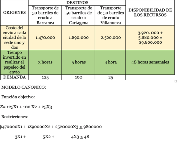 Tiempo requerido para realizar el papeleo del envió a Barrancabermeja: 3 horas. Tiempo requerido para realizar el papeleo del envió a Cartagena: 5 horas. Tiempo requerido para realizar el papeleo del envió a Villanueva: 4 horas. La empresa quiere los costos mínimos y el tiempo requerido para realizar el papeleo del envió a cada destino.