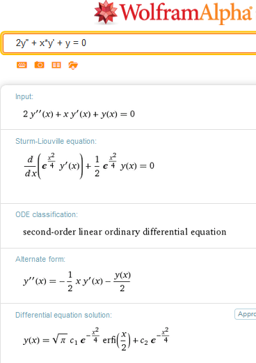 $$\begin{align}&y=C_0\sum_{n=0}^{\infty}\frac{(-1)^nx^{2n}}{2^{2n}· n!}+C_1\sum_{n=0}^{\infty}\frac{(-1)^nx^{2n+1}}{\frac{(2n+1)!}{n!}}=\\&\\&C_0\sum_{n=0}^{\infty}\frac{(-1)^n}{n!}\left( \frac{x^2}{4} \right)^n+C_1\sum_{n=0}^{\infty}\frac{(-1)^nx^{2n+1}}{\frac{(2n+1)!}{n!}}\\&\\&y=C_0\,e^{-\frac{x^2}4}+C_1\sum_{n=0}^{\infty}\frac{(-1)^nx^{2n+1}}{\frac{(2n+1)!}{n!}}\end{align}$$Eso lo sabía hacer yo. Ahora bien, WolframAlpha también reduce el segundo sumatorio a una función eso sí, una función especial.}