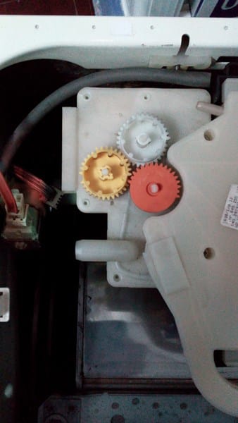 El display da código de error CE (que el manual no especifica) y las palabras "LAVADO, ACLARADO, ACLARADO +" permanecen encendidas intermitentemente. Después de apagar y al arrancar de nuevo con el lavado hace un ruido:"clak-clak-clak". Desmontada la tapa y detrás del cajón para el detergente, por donde llega el agua, lleva unas ruedas dentadas de plástico (lleva tres una naranja, otra amarilla y otra blanca) son las que hacen el ruido al saltar (no hacen bien el engranaje como que se saltan los dientes...). El programa de lavado se para. ¿Cómo podría solucionarlo?.