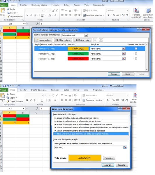 Si la celda A1 es mayor a la celda B1 colocar un color o icono de color verde, de los contrario si es menor colocarlo de color rojo, esto mismo para la celda B1; si ambas celdas son iguales colocar un color o icono de color amarillo en ambas celdas.
