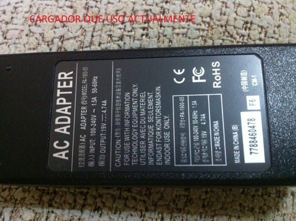 Adjunto fotos de dichos cargadores. En la foto del que utilizo actualmente he puesto "cargador que uso actualmente", y en la foto del cargador sobre el cual pregunto he puesto "cargador sobre el cual pregunto".