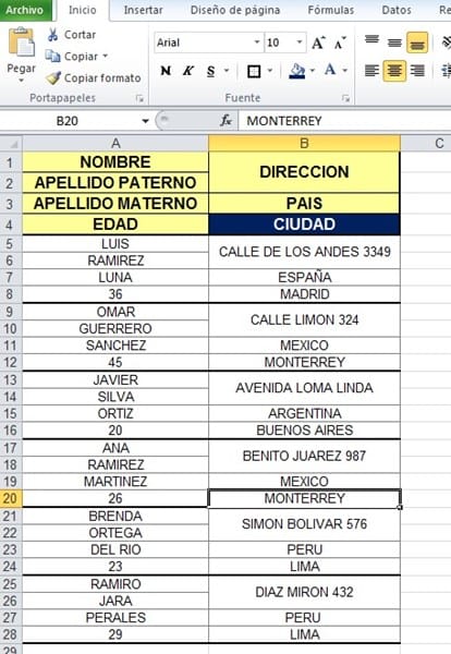 Y en la otra imagen se ve lo mismo pero con el campo "CIUDAD", B8, B12, B16, B20, B24, B28... Y se colorea B4 ya que es su celda de encabezado y se deja de colorear la que ya no corresponde y asi correspondientemente.
