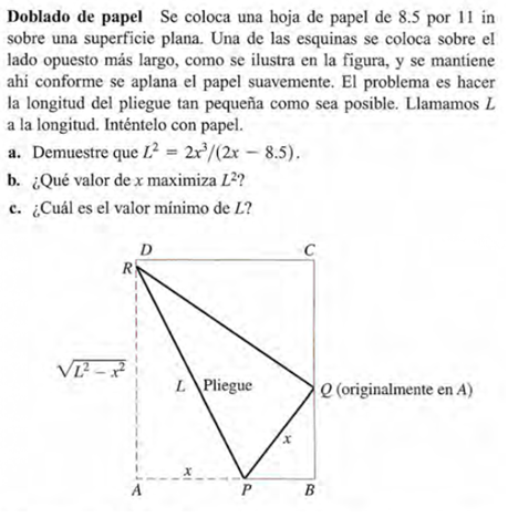 $$\begin{align}&sen\,\alpha= \frac{\sqrt{L^2-x^2}}{L}\\&\\&\cos \alpha = \frac{x}{L}\\&\\&\overline {PB}=x·\left(\frac{L^2-x^2}{L^2}-\frac{x^2}{L^2}\right)=x-\frac{2x^3}{L^2}\\&\\&\overline{AP}+\overline{PB}=8.5\\&\\&x+x-\frac{2x^3}{L^2}=8.5\\&\\&2xL^2-2x^3 = 8.5L^2\\&\\&2xL^2-8.5L^2=2x^3\\&\\&L^2=\frac{2x^3}{2x-8.5}\\&\\&\\&b) \\&\text{Como x es positiva}\\&0\le x \le 8.5\\&\text{y también como}\\&0\le L^2(x)=\frac{2x^3}{2x-8.5}\implies 2x-8.5\ge0\implies x\ge 4.25\\&\text{Por otra parte}\\&\sqrt{L^2-x^2}\le11\implies L^2 \le 121+x^2\implies\\&\frac{2x^3}{2x-8.5}\le 121+x^2\implies\\&\\&2x^3\le 242x+2x^3-1028.5-8.5x^2\\&8.5x^2-242x+1028.5\le0\\&\\&x=\frac{242\pm \sqrt{242^2-4·8.5·1028.5}}{17}=\frac{242\pm \sqrt{23595}}{17}\\&x\in[5.199609383,\; 23.27097885]\\&\\&\text{Y con las condiciones de más arriba}\\&x\in[5.199609383,\; 8.5]\\&\\&\text{derivamos e igualamos a 0}\\&\frac{d L^2}{dx}=\frac{6x^2(2x-8.5)-2x^3·2}{(2x-8.5)^2}=\frac{8x^3-51x^2}{(2x-8.5)^2}=0\\&x=\frac {51}8= 6.375\\&\text{Calculamos la función }L^2 \text{en ese punto y los}\\&\text{extremos, alguno de los tres será el máximo}\\&L^2(6.375)=121.921875\\&L^2(5.199609383)=148.0359378\\&L^2(8.5)=144.5\\&\\&\text{Luego el maximo es }\\&\\&x=\frac{242\pm \sqrt{23595}}{17}\approx 5.199609383\\&\\&\\&c)\\&\text{El mínimo de }L^2 \text{ es en } x=6.375\\&\text{Como L es positiva el minimo de L se da}\\&\text{en el mismo punto que } L^2\\&\\&\text{luego en }x=6.375\end{align}$$
