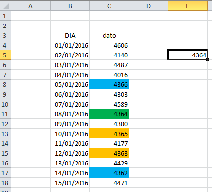 Lo que necesito es una macro que cuando yo escriba ponga un dato concreto en la celda E5, coloree en verde las celdas de toda la columna B con el mismo valor, en amarillo las que tienen una diferencia de +/- 1 con respecto al número escrito y en azul, las que tienen una diferencia de +/- 2 con respecto al número escrito. Como se ve en el ejemplo