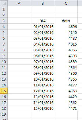 Tengo una base de datos con dos columnas, en una está la fecha y en otra un dato numérico, como se ve en el ejemplo. El rango de filas llegaría hasta el año completo, redondeando, 370 filas.