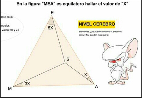 $$\begin{align}&ang\,ASM=180º - 3x-(60º-x)=120º-2x\\&ang\,ASE = 180º -x -(60º-5x) = 120º+4x\\&ang\,ESM =120º-5x-(60º-3x)=120º-2x\\&\\&\text{luego}\\&\\&ang\,ASM=ang\,ESM\\&\\&\text{Por el teroma de los senos}\\&\\&\frac{sen ASM}{1}=\frac{sen 3x}{AS}=\frac{sen(60º-x)}{MS}\\&\\&\frac{sen ESM}{1}=\frac{sen{ASM}}{1}=\frac{sen 5x}{MS}=\frac{60º-3x}{ES}\\&\\&\text{En particular nos interesa esta deducción}\\&\\&\frac{sen(60º-x)}{MS}=\frac{sen 5x}{MS}\\&\\&sen(60º-x) = sen(5x)\\&\\&\text{como ambos ángulos son menores de 60º son iguales}\\&\\&60º-x=5x\\&\\&60º=6x\\&\\&x= 10º\\&\end{align}$$Y eso es todo, saludos.