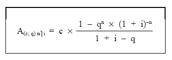 Que es el valor actual de una renta en progresión geométrica q de n cuotas de valor inicial c con interés períodico i.