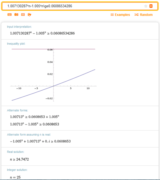 $$\begin{align}&i_m=(1+i_a)^{\frac 1{12}}-1=1.089^{\frac 1{12}}-1=\\&1.007130287-1 = 0.007130287\\&\\&\text{Y sustituyendo datos será}\\&S_{(700;\;1.05)n¬\,0.007130287)}=\\&\\&1.007130287^n·700·\frac{1-1.005^n(1.007130287)^{-n}}{1.007130287-1.005}\ge 20000\\&\\&1.007130287^n·\left( 1-\left(\frac{1.005}{1.007130287}\right)^n \right)\ge \frac{20000·0.002130287}{700}\\&\\&1.007130287^n-1.005^n\ge0.06086534286\end{align}$$