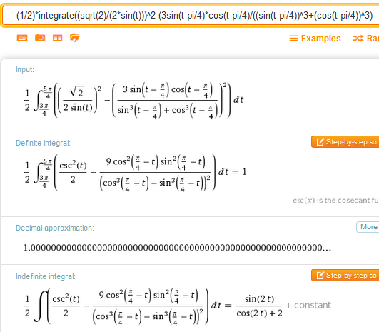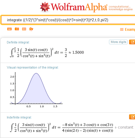 $$\begin{align}&A=\frac 12\int r^2\;d\theta\\&\\&\text{Para el bucle, la calculo si}\text{n girar, que lo había}\\&\text{hecho así al principio y es más corto de escribir}\\&\\&A=\frac 12\int_0^{\frac \pi 2}\left(\frac{3 sen\,t ·\cos t}{sen^3t+\cos^3t}\right)^2\;d\theta=1.5\\&\\&\text{La hice con WolframAlpha}\\&\\&\end{align}$$