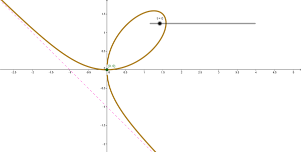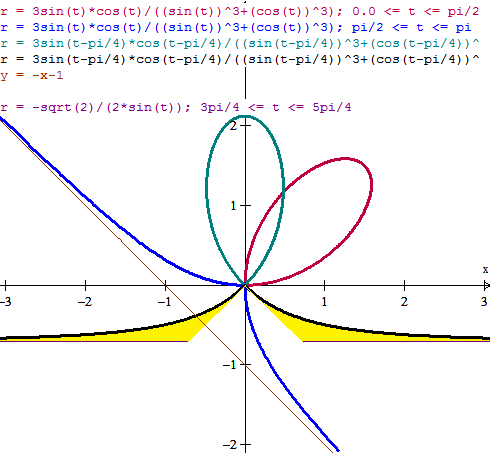 $$\begin{align}&r= \sqrt{\left(\frac{3t}{1+t^3} \right)^2+\left(\frac{3t^2}{1+t^3} \right)^2}=\frac{3t \sqrt{1+t^2}}{1+t^3}\\&\\&\theta=arctg\, t\implies t=tg\,\theta\\&\\&r=\frac{3tg\theta \sqrt{1+tg^2 \theta}}{1+tg^3\theta}=\frac{3 sen\theta}{\cos\theta\left(1+\frac{sen^3\theta}{\cos^3\theta} \right)\cos\theta}\\&\\&r=\frac{3 sen\theta\, \cos\theta}{\cos^3\theta+sen^3\theta}\\&\\&\text{La giro 45º para que sea fácilmente calculable}\\&\text{después la ecuación de la asíntota}\\&\\&r=\frac{3 sen\left(\theta-\frac \pi 4\right)\, \cos\left(\theta-\frac \pi 4\right)}{\cos^3\left(\theta-\frac \pi 4\right)+sen^3\left(\theta-\frac \pi 4\right)}\\&\\&\text{El bucle es la curva entre }\frac{\pi}4\le\theta\le \frac {3\pi}{4}\\&\text{Las ramas entre }\frac{3\pi}4\le\theta\le \frac {5\pi}{4}\\&\\&\text{La asíntota convertida ahora en horizontal es}\\&r=-\frac{\sqrt 2}{2\,sen\,t}\\&\\&\text{Tomada lo mismo que las ramas, entre }\frac{3\pi}4\le\theta\le \frac {5\pi}{4}\\&\text{le falta el segmento en el centro de longitud } \sqrt 2\\&\\&\end{align}$$
