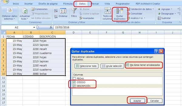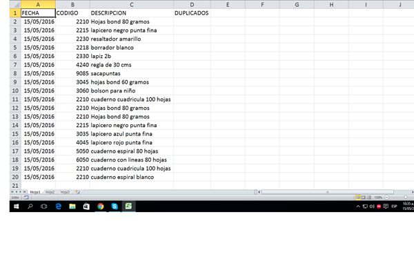 Como se darán cuenta el código 2210 es el que se repite varias veces el mayor inconveniente es que también el mismo código a veces hace referencia a otro producto y como les comentaba el archivo contiene más de 500,000 registros y estarlos buscando manualmente es un dolor de cabeza ya que hay muchos códigos que se repiten y que muchas veces tienen diferentes descripciones, en resumen lo que necesito es que de alguna manera excel me muestre en la columna código: todos los códigos que se repiten en el mismo archivo y asimismo en la columna descripción me remarque todos los que coinciden con ese código aunque tenga una descripción diferente, espero no haber hecho muy complicada mi pregunta y de antemano agradezco su ayuda feliz día.