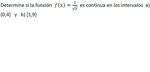 Determine si la función ?(?) = 1 / √? Es continua en los intervalos a) (0,4] y b) [1,9].