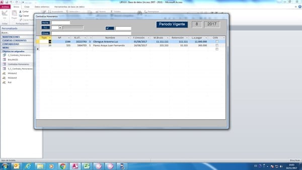 Lo que he podido lograr es que en un formulario llamado “centraliza honorarios” coloque dos campos, uno de mes y el otro de año para poder filtrar en un subformulario, las boletas de un periodo en particular, además a la tabla de Libro de honorarios le agregue un campo si/no con el objetivo que si son marcados se traspasaran a la tabla Asiento y su relacionada DYH y cuando consulte nuevamente solo aparecerán los que faltan por traspasar.