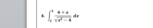 $$\begin{align}&\int_2^5 \frac{4+x}{\sqrt{x^2-4}}dx=\lim_{k\to 2^+}\int_k^{5}\frac{4+x}{\sqrt{x^2-4}}dx\\&\\&\text{Mira, esto se resuelva con un cambio hiperbólico,}\\&\text{con uno trigonométrica es un martirio.}\\&\text{De momento calcularemos la indefinida solo}\\&\\&\int \frac{4+x}{\sqrt{x^2-4}}dx =\\&\\&x=2\;cosh\, t \implies t=arg\,cosh \frac x2\\&dx = 2\,senh\,t\;dt\\&\\&=\int \frac {4+2cosh\,t}{\sqrt{4cosh^2t-4}}·2senh\,t\;dt=\\&\\&\int \frac{4+2cosh\,t}{2 \sqrt{cosh^2t-1}}·2senh\,t\;dt=\\&\\&\int \frac{4+2cosh\,t}{\sqrt{senh^2t}}·senh\,t\;dt=\\&\\&\int(4+2cosht)dt=\\&\\&4t+2senht=\\&\\&4\,arg\,cosh \frac x2+2 senh\left(arg\,cosh \frac x2\right)=\\&\\&4·ln\left(\frac x2+\sqrt{\left(\frac x2\right)^2-1} \right)+2senh\left(arg\,senh \sqrt{\left(\frac x2 \right)^2-1} \right)=\\&\\&2ln(x+\sqrt{x^2-4}) +2 \sqrt{\left(\frac x2 \right)^2-1}=\\&\\&2ln(x+\sqrt{x^2-4})+\sqrt{x^2-4}\\&\\&\text{Y ahora evaluamos el límite}\\&\\&\int_2^5 \frac{x+4}{\sqrt{x^2-4}}= \lim_{k\to 2^+}\left[ 2ln(x+\sqrt{x^2-4})+\sqrt{x^2-4}\right]_k^5=\\&\\&2ln(5+\sqrt{21})+\sqrt{21}-2\,ln\,2\\&\end{align}$$Y eso es todo. Si acaso te dejo el enlace donde puedes ver como son las utilísimas funciones hiperbólicas. Te aparecerá automáticamenteparte del artículo y algún sitio donde pinchar para verlo completo