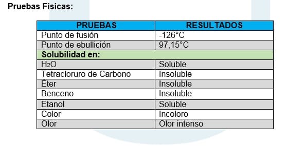Un laboratorista desea determinar la naturaleza química de un compuesto desconocido, y para ello realiza una serie de pruebas físicas, Químicas y una espectroscópica, obteniéndose los siguientes resultados.