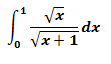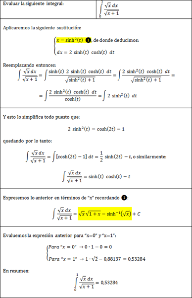 $$\begin{align}&1+tg^2u = sec^2u\implies\\&tg^2u = sec^2u-1\\&\\&\text{Y esto es lo que necesitamos}\\&\\&2\int \sqrt{t^2-1}dt=\\&\\&t=sec\,u\\&dt=sec\,u·tg\,u\;du\\&\\&2\int \sqrt{sec^2u-1}·sec\,u·tg\,u \;du=\\&\\&2\int \sqrt{tg^2u}·sec\,u·tg\,u \;du=\\&\\&2\int sec\,u·tg^2\,u \;du=\\&\\&2\int \frac{sen^2u}{\cos^3u}du=\\&\\&\text{Ahora viene el cambio trigonométrico universal}\\&\text{que no lo voy a explicar}\\&\\&tg \frac u2=z\implies sen\,u=\frac{2z}{1+z^2},\quad \cos u=\frac {1-z^2}{1+z^2}\\&\\&du= \frac{2}{1+z^2}dz\\&\\&=2\int\frac{\left(\frac{2z}{1+z^2} \right)^2}{\left(\frac{1-z^2}{1+z^2}\right)^3}·\frac {2}{1+z^2} dz=\\&\\&4\int \frac{4z^2}{(1-z^2)^3}dz=\\&\\&\text{Lo siento pero esto es demasiado. ¡6 raíces }\\&\text{con repeticiones! Puedes usar el método normal}\\&\text{o Hermite. Yo usaré el programa Máxima}\\&\\&=ln |z-1|-ln|z+1|+\frac{2z^3+2z}{z^4-2z^2+1}\\&\\&\text{Y deshacer los cambios sería horrible, lo }\\&\text{que haremos es calcularlos extremos}\\&\text{de las nuevas variables}\\&x\bigg|_0^1\\&\\&t = \sqrt {x+1}\implies t\bigg|_1^{\sqrt 2}\\&\\&u=arc sec\; t\implies u\bigg|_0^{arc sec\, \sqrt {2}}\\&\\&z=tg \frac u2\implies z\bigg|_0^{tg\left(\frac{arc sec\, \sqrt 2}{2} \right)}\\&\\&\text{El arco cuya secante es } \sqrt 2\\&\text{es le arco cuyo coseno es } \frac{1}{\sqrt 2}\\&\text{Y aunque no lo reconozcamos así, es superfamoso}\\&\frac{1}{\sqrt 2}=\frac{\sqrt 2}{2}\implies arcsec \,\sqrt 2=\frac{\pi}{4}\\&\\&z\bigg|_0^{tg\left(\frac{\pi/4}{2} \right)}=\\&\\&\text{Aplicando la fórmula}\\&\\&tg \frac{A}{2}= \frac{-1\pm \sqrt{1+ tg^2A}}{tgA}\\&\\&= z\bigg|_0^{-1+\sqrt 2}\\&\\&\text{Y lo siento pero de nuevo usaré el ordenador,}\\&\text{ no estoy para evaluar en ese punto a mano}\\&\\&\int_0^1 \frac{\sqrt x}{\sqrt{x+1}}dx=\\&\\&\left[ ln |z-1|-ln|z+1|+\frac{2z^3+2z}{(z^2-1)^2}\right]_0^{-1+ \sqrt 2}=\\&\\&ln(2- \sqrt 2)-ln \sqrt 2+\frac{2(\sqrt 2-1)^3+2(\sqrt 2-1)}{((\sqrt 2-1)^2-1)^2}=\\&\\&ln(\sqrt 2-1)+\frac {12 \sqrt 2-16}{12-8 \sqrt 2}=\\&\\&ln(\sqrt 2-1)+\frac{3 \sqrt 2-4}{3-2 \sqrt 2}=\\&\\&ln(\sqrt 2-1)+\frac{(3 \sqrt 2-4)(3+2 \sqrt 2)}{9-8}=\\&\\&ln(\sqrt 2-1)+ \sqrt 2 \approx\\&\\&0.53283997535355\end{align}$$Y eso es todo. Si quieres la resolución por cambio hiperbólico manda otra pregunta, en esta ya he trabajado mucho.
