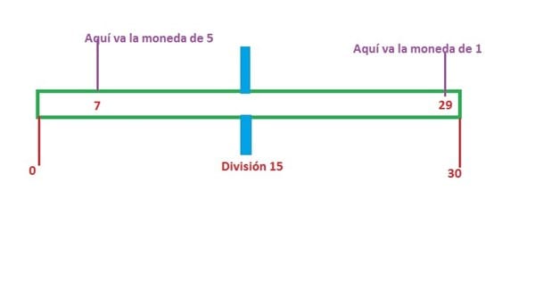 Un estudiante sabe que las monedas de 1 peso tienen una masa de 4.0 g, pero desconoce la masa de las monedas de 5 pesos. Para determinarla, arma una “balanza” equilibrando una regla homogénea de 30 cm sobre un lápiz situado horizontalmente en una mesa. Si encuentra que al colocar la moneda de 1 peso en la división de 29 cm, para que la regla permanezca en equilibrio debe colocar a la de 5 pesos en la división de 7 cm, ¿cuál es la masa de las monedas de 5 pesos?