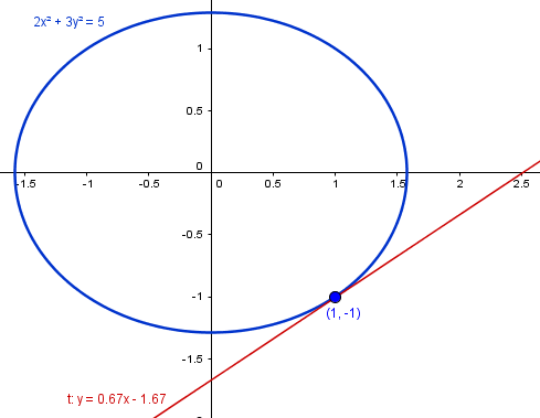 Encontrar la ecuación de la recta l tangente a la elipse en el punto (1,-1). Incluir la gráfica que muestre cómo la recta es tangente a la elipse.