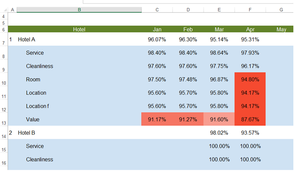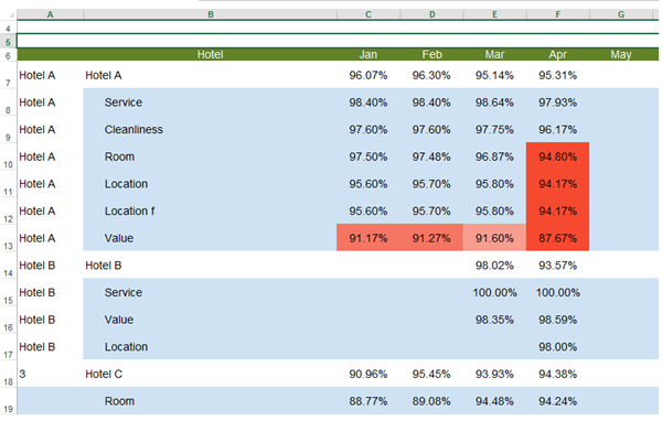 At the end I would like to remove those rows where the name of the hotel is in both column A and B, in order to use column A for Hotels Name and B just for departments.