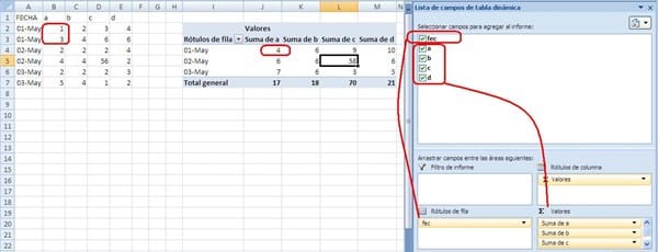 Arrastra la fecha a "Rótulos de fila" y cada campo de columna lo arrastras a "Valores"