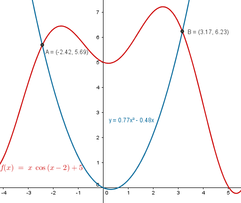 $$\begin{align}&\int_{-2.45}^{3.2} (x\,\cos(x-2)+5-(0.77x^2-0.48x))dx=\\&\\&\int_{-2.45}^{3.2} (x\,\cos(x-2)+5-0.77x^2+0.48x)dx=\\&\\&\left[5x-\frac{0.77x^3}{3}+0.24x^2 \right]_{-2.45}^{3.2}+\int_{-2.45}^{3.2}xcos(x-2)dx\\&\\&5·3.2-\frac{0.77·3.2^3}{3}+0.24·3.2^2+5·2.45-\frac{0.77·2.45^3}{3}-0.24·2.45^2+\\&\\&+\int_{-2.45}^{3.2}xcos(x-2)dx=\\&\\&17.0819745833+\int_{-2.45}^{3.2}xcos(x-2)dx\\&\\&\text{Hago la integral que queda por partes}\\&\\&u=x\qquad\qquad\qquad\; du=dx\\&dv=\cos(x-2)dx\quad v=sen(x-2)\\&\\&xsen(x-2)\bigg|_{-2.45}^{3.2} -\int_{-2.45}^{3.2} sen (x-2)dx =\\&\\&3.2 sen(3.2-2)-(-2.45)sen(-2.45-2)+\cos(x-2)\bigg|_{-2.45}^{3.2}\\&\\&3.2sen(1.2)+2.45sen(-4.45)+\cos(1.2)-\cos(-4.45) =\\&\\&5.97041533088\\&\\&\text{Sumamos las dos cantidades}\\&\\&17.0819745833+5.97041533088= 23.05238991418\\&\\&\end{align}$$