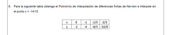 Para la siguiente tabla obtenga el Polinomio de Interpolación de diferencias finitas de Newton e Interpole en el punto por = -14/15