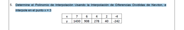 Determine el Polinomio de Interpolación Usando la Interpolación de Diferencias Divididas de Newton, e interpole en el punto por = 3