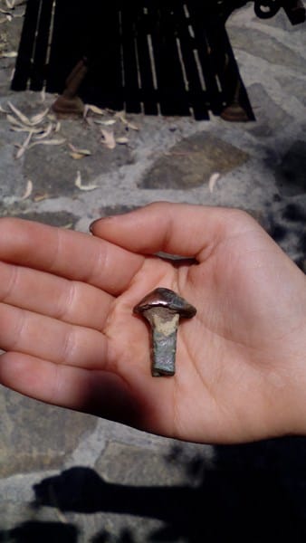 Mi hijo se ha encontrado un clavo que tiene un aspecto muy antiguo. La parte que se encontraba al descubierto es cobriza. La cabeza no tiene mucha forma pero más bien ovalada y mide 1,5/2 cmts. La punta tiene 4 lados y mide cada uno de ellos en su unión con la cabeza unos 8/9 mm. Esta punta parece rota (es decir que podía ser más larga) y en la sección rota se aprecia un agujerito que cabe la punta de un tenedor. Alguien podría identificar la antigüedad.