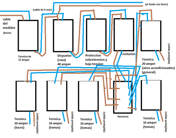 Básicamente tengo la entrada en cable de 6mm que a a un disyuntor de 40 amper.